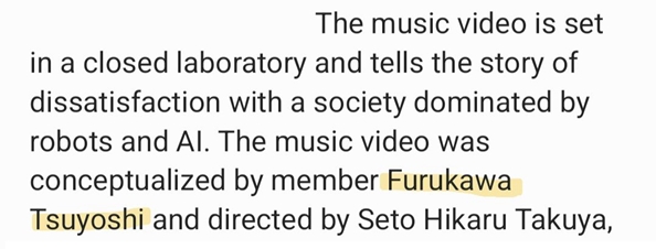 On first watch I was like “damn is this about fighting against AI?” and later, it was confirmed that yes, the music video is about a society being controlled by AI and breaking free from it. It made me very happy that this was explicitly confirmed and is something they’ll further elaborate on in interviews. And guess who came up with this concept… right, right…. It was Tsuyoshi. I’m not surprised! This is why you’re my favorite!!!